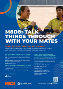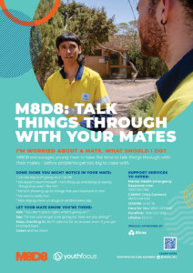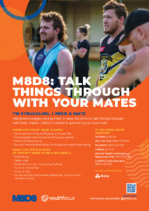 M8D8 isn’t about being worried about someone, it’s about making time to hang out and be real, in person – and looking after each other. M8D8 encourages young men to take the time on May 8 to be there for a mate’s mental health.