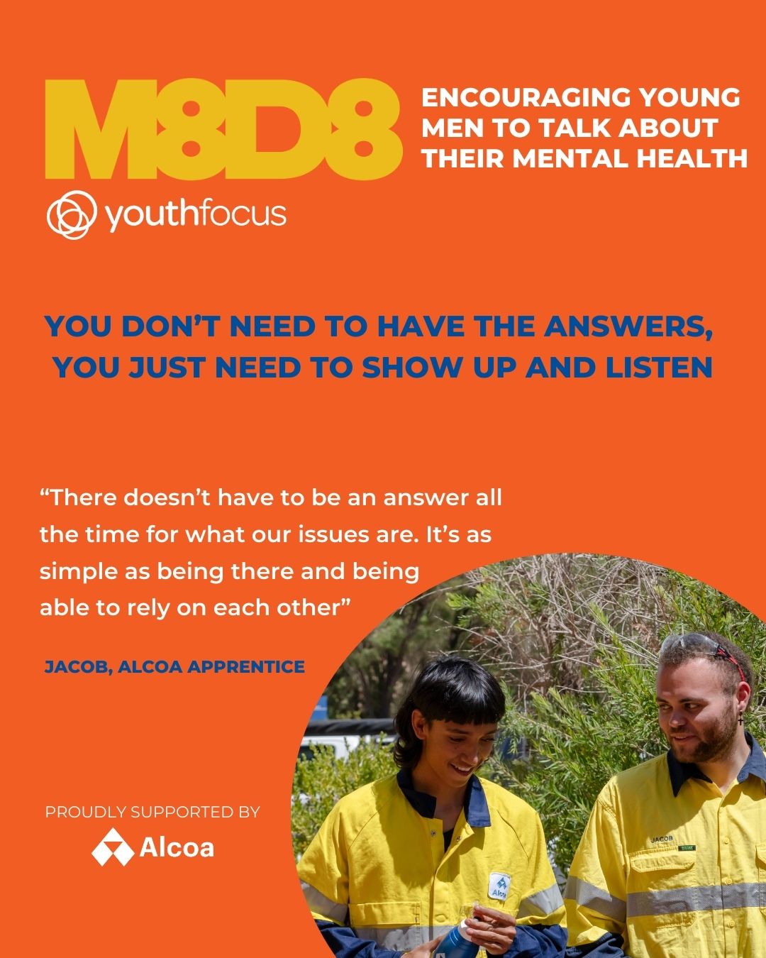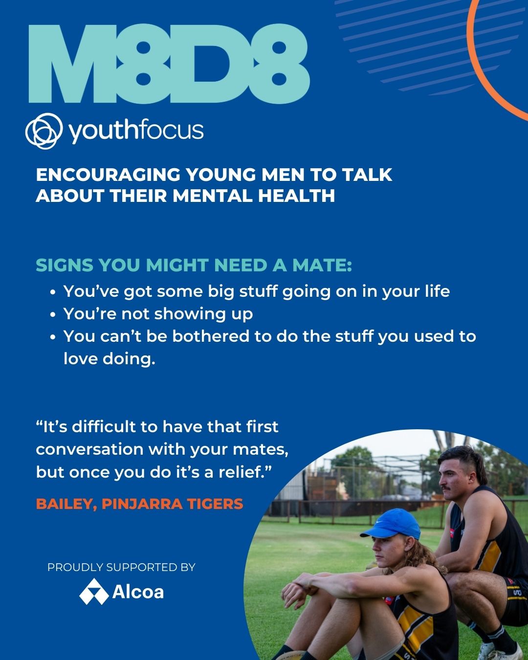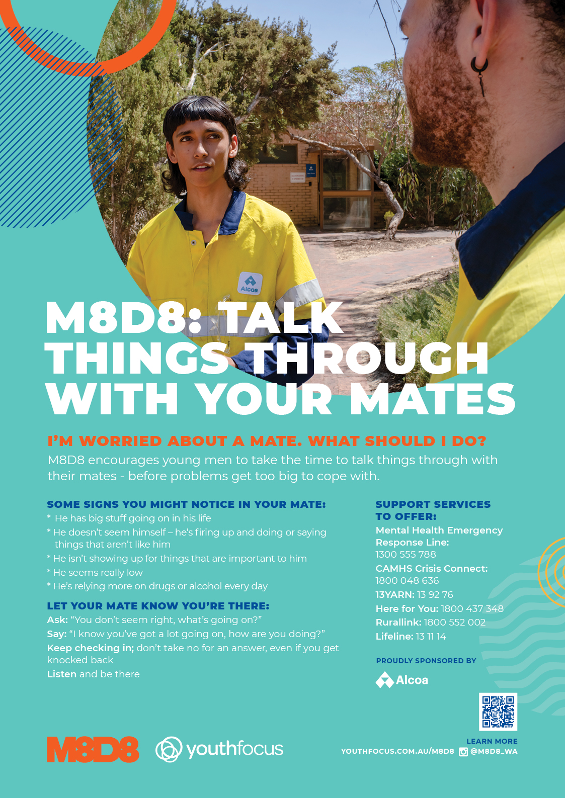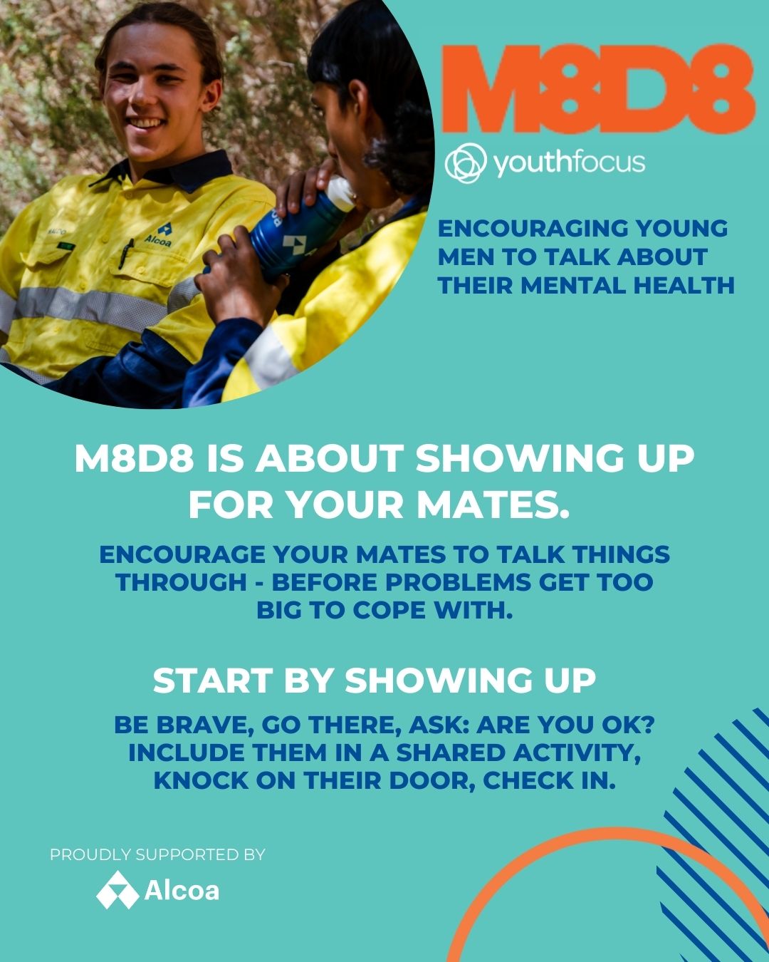 This campaign was created by young men in the Peel and South West regions and is proudly supported by Alcoa. It aims to promote and support conversations about mental health among young men.